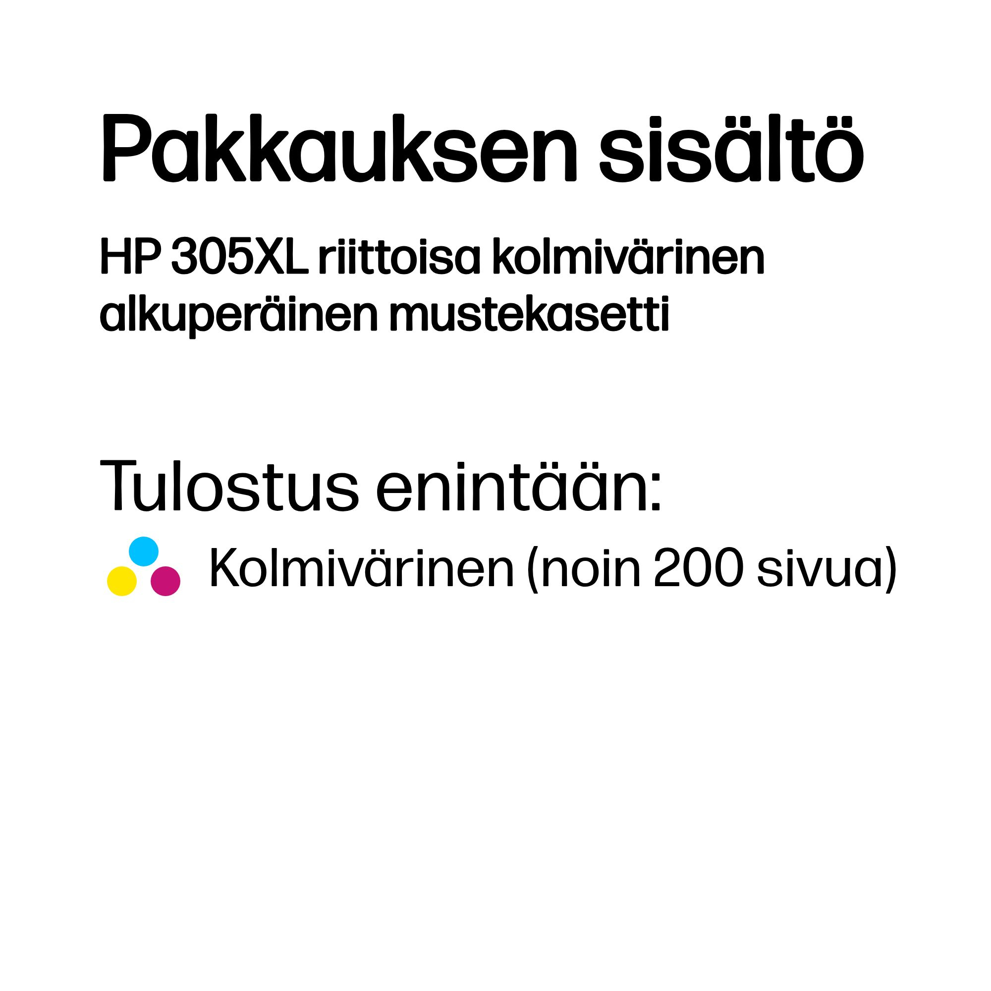 | Laatikon sisältö | HP 305XL riittoisa kolmivärinen alkuperäinen mustekasetti |