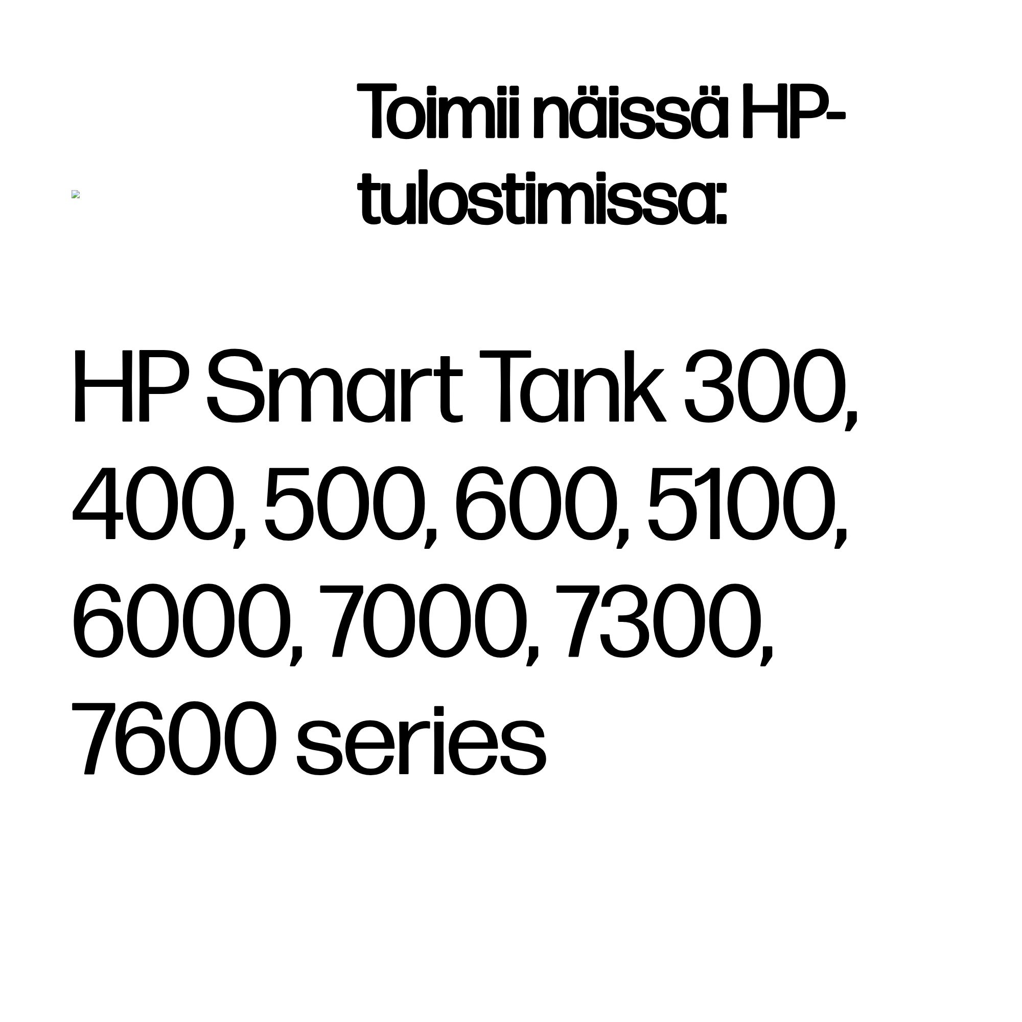 | Yhteensopivuus | HP Ink Tank 310 series, HP Ink Tank Wireless 410 series, HP Smart Tank 350 series, HP Smart Tank Wireless 450 series, HP Smart Tank Plus 650 series |