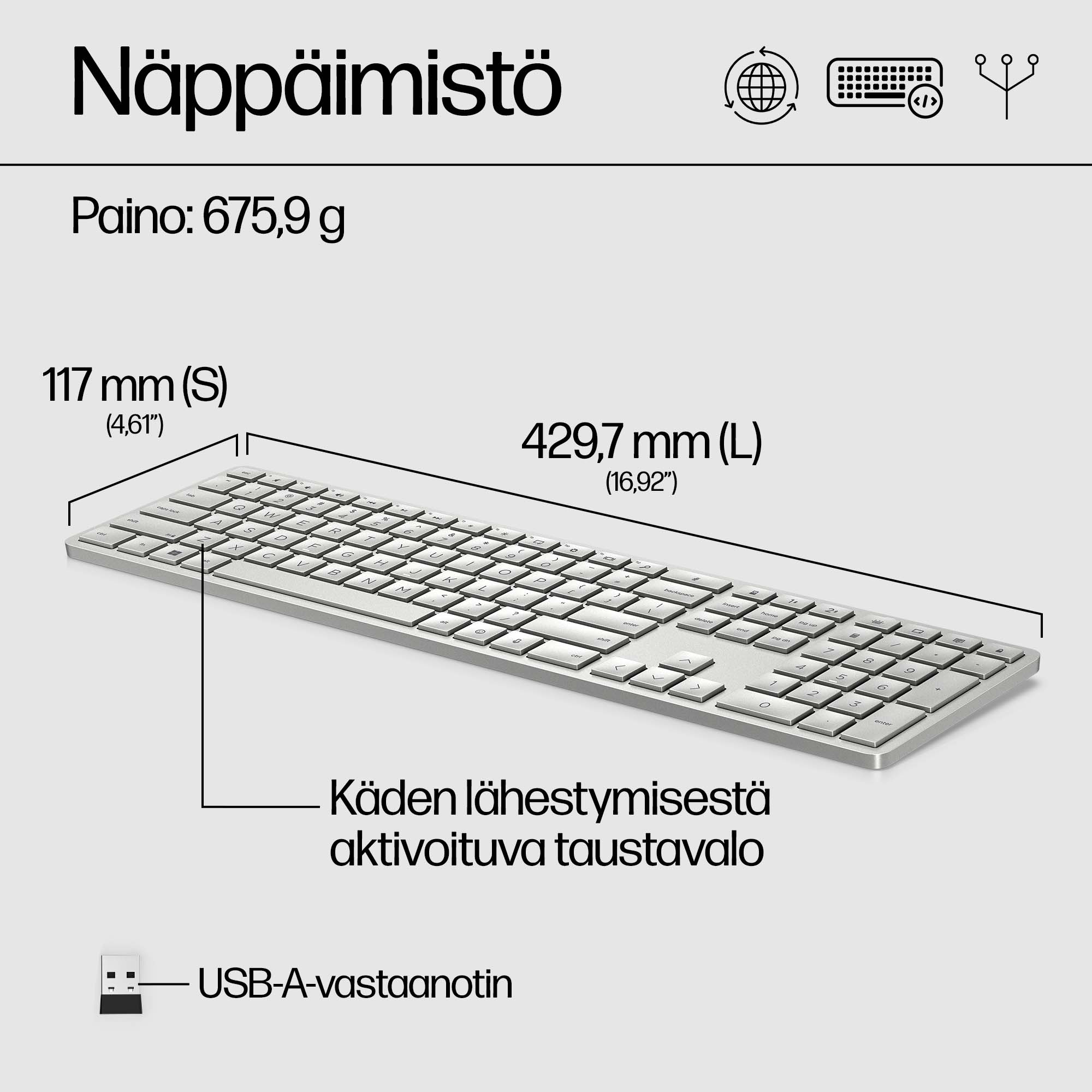 | Näppäimistön mitat (LxSxK) | 12,2 x 429,7 x 117 mm |