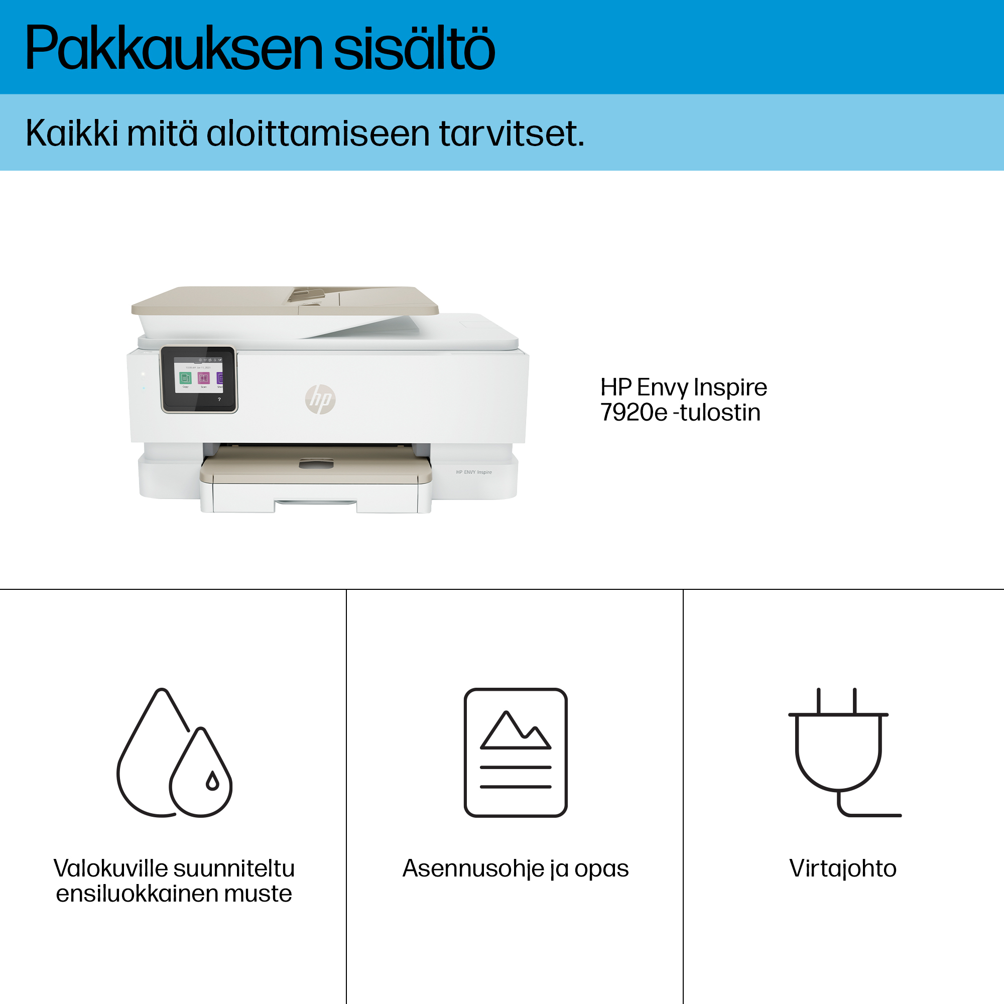 | Laatikon sisältö | HP ENVY Inspire 7920e All-in-One -tulostin; HP 303 musta Instant Ink Ready -aloituspatruuna; HP 303 kolmivärinen Instant Ink Ready -aloituspatruuna; tarvikehuomautus; säännöstiedote; asennusopas; pikaopas; näytepakkaus kiiltävästä ja matasta HP Advanced -valokuvapaperista; virtajohto [Lisätietoja musteen määrästä ja sivuriittoisuudesta on osoitteessa http://hp.com/go/learnaboutsupplies] |