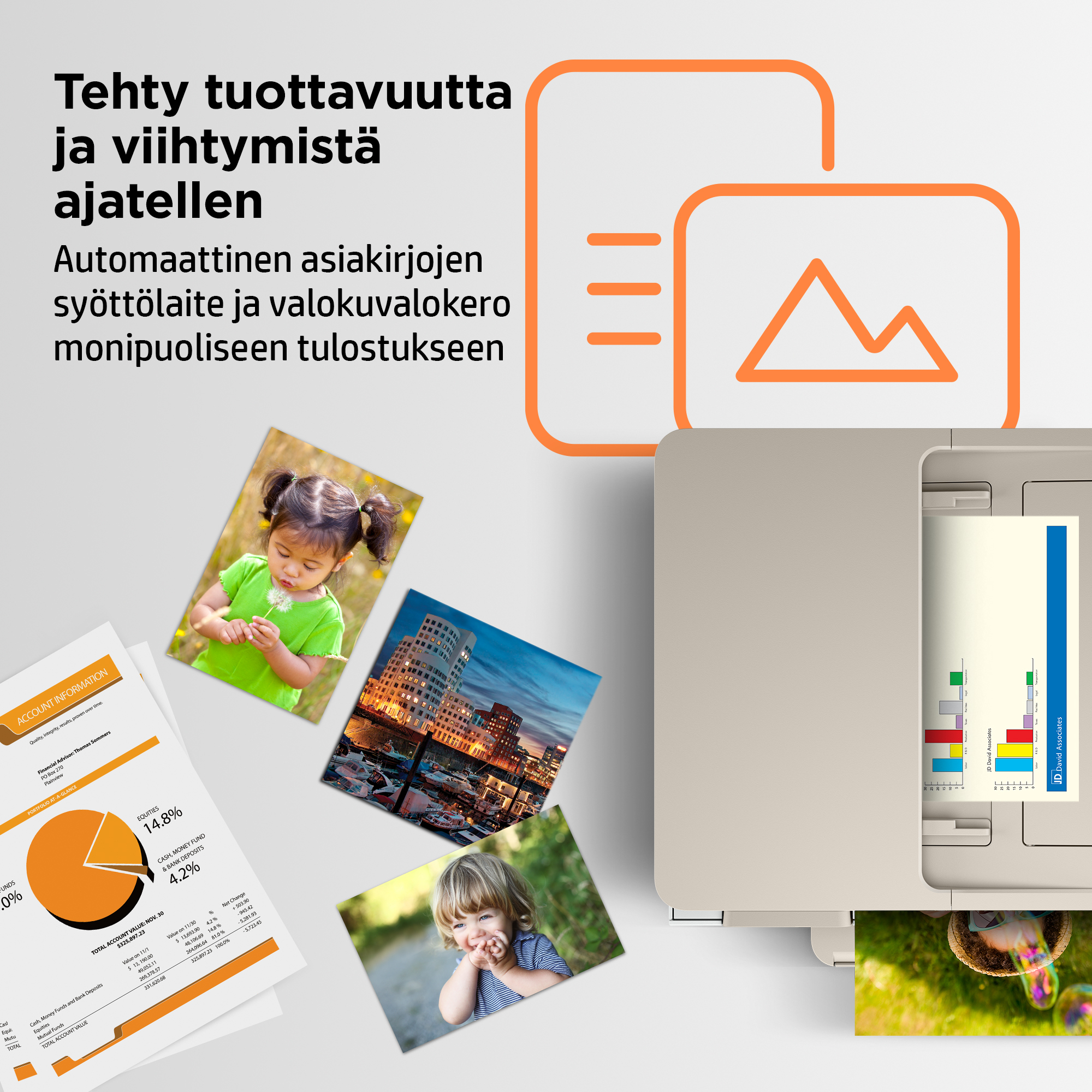 Saumaton korkealaatuisten valokuvien ja asiakirjojen tulostus kiinteällä valokuvalokerolla ja automaattisella asiakirjojen syöttölaitteella.