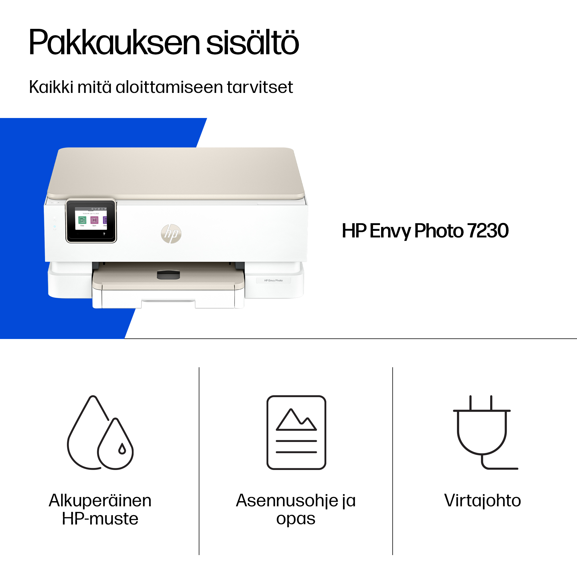 | Laatikon sisältö | HP Envy Photo 7230 All-in-One -tulostin; HP 303 musta alkuperäinen mustepatruuna; HP:n kolmivärinen alkuperäinen aloitusmustepatruuna; Asennusopas; Pikaopas; Virtajohto |