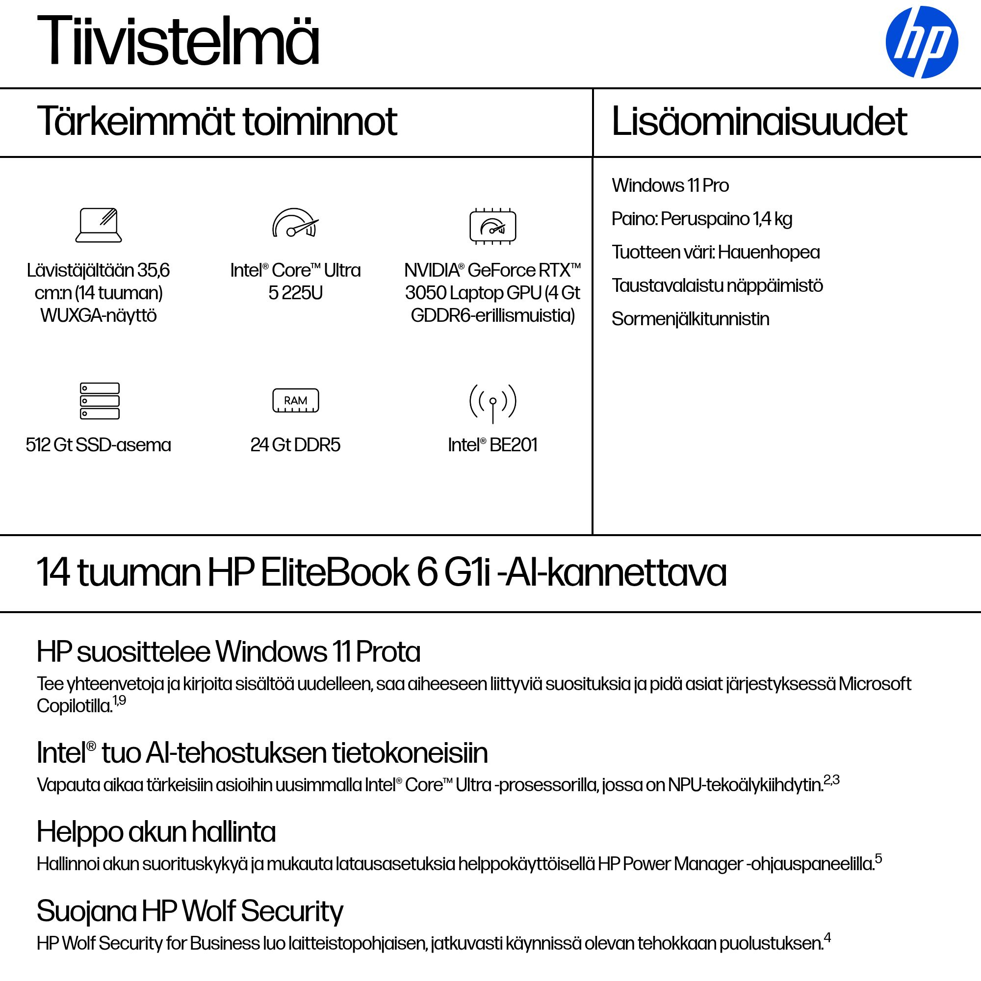 HP EliteBook 6 EB6G1i14 U5 225U 14 24GB/512 PC NX Copilot+ PC Intel Core Ultra 5 Kannettava tietokone 35,6 cm (14") WUXGA DDR5-SDRAM 512 GB SSD Wi-Fi 7 (802.11be) Windows 11 Pro AI PC Hopea