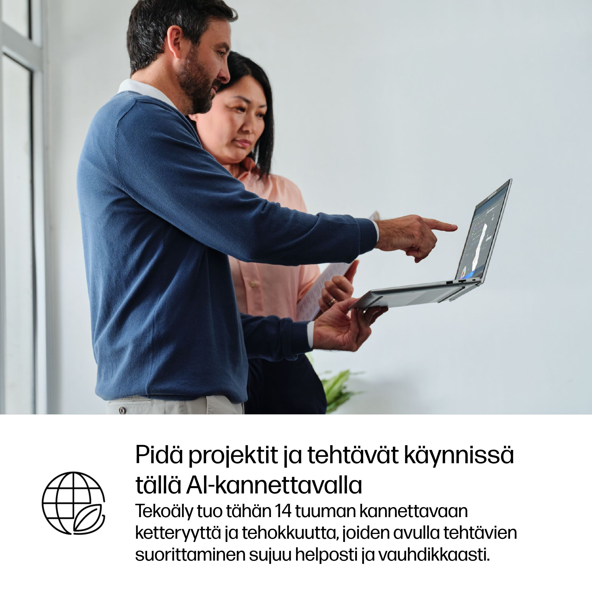 AI-pohjaiset käyttökokemukset ja moderni liitettävyys parantavat käyttäjien tuottavuutta. Konfiguroitava 14 tuuman HP EliteBook 6 G1i -AI-kannettava tarjoaa 11 TOPS:n NPU:n[3], yritystason tietoturvan ja hallittavuuden ja täyttää yrityskäyttäjien vaativat tarpeet.