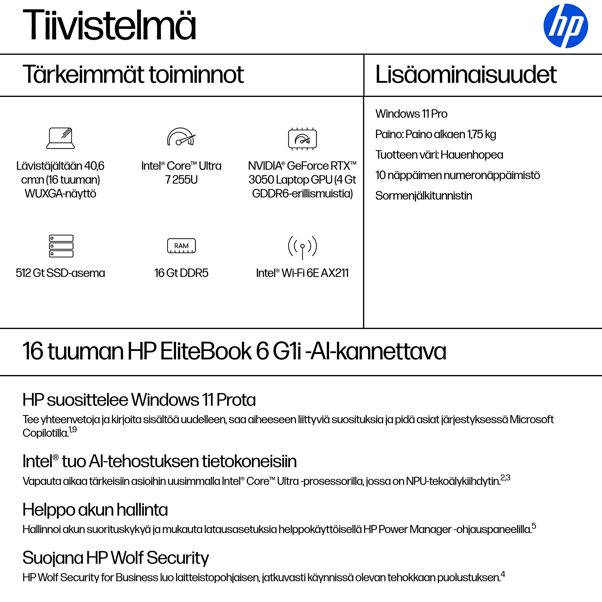 AI-pohjaiset käyttökokemukset ja moderni liitettävyys parantavat käyttäjien tuottavuutta. Konfiguroitava 16 tuuman HP EliteBook 6 G1i -AI-kannettava tarjoaa 11 TOPS:n NPU:n[3], yritystason tietoturvan ja hallittavuuden ja täyttää yrityskäyttäjien vaativat tarpeet.