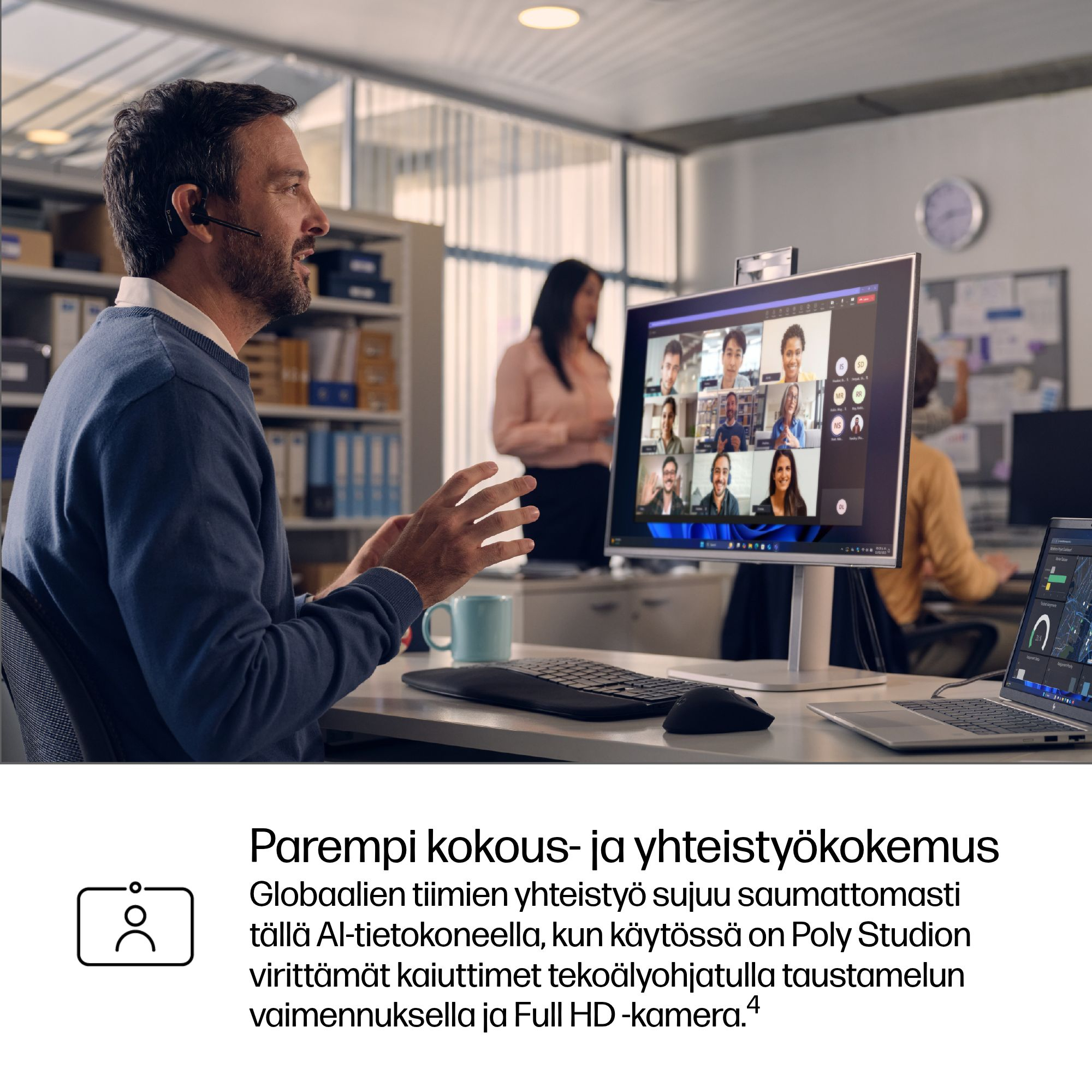 Näytä parhaimmiltasi videopuheluissa ja säästä samalla virtaa. Hallitse sisäisten ja ulkoisten kameroiden videosäätimiä Poly Camera Prolla. Automaattinen kehys, Spotlight, taustasumennus ja virtuaaliset taustat säästävät virtaa, kun ne suoritetaan NPU:lla.[11]
