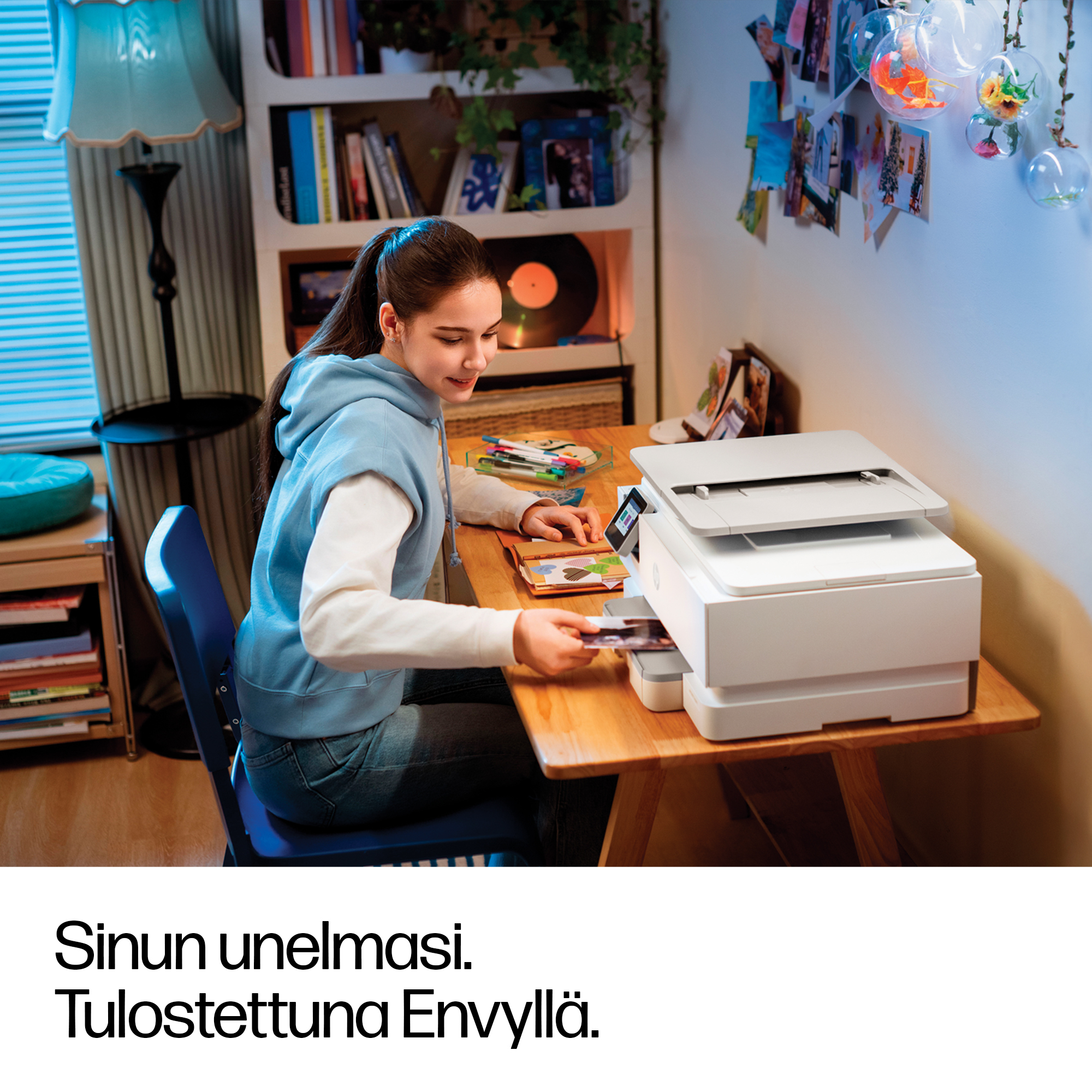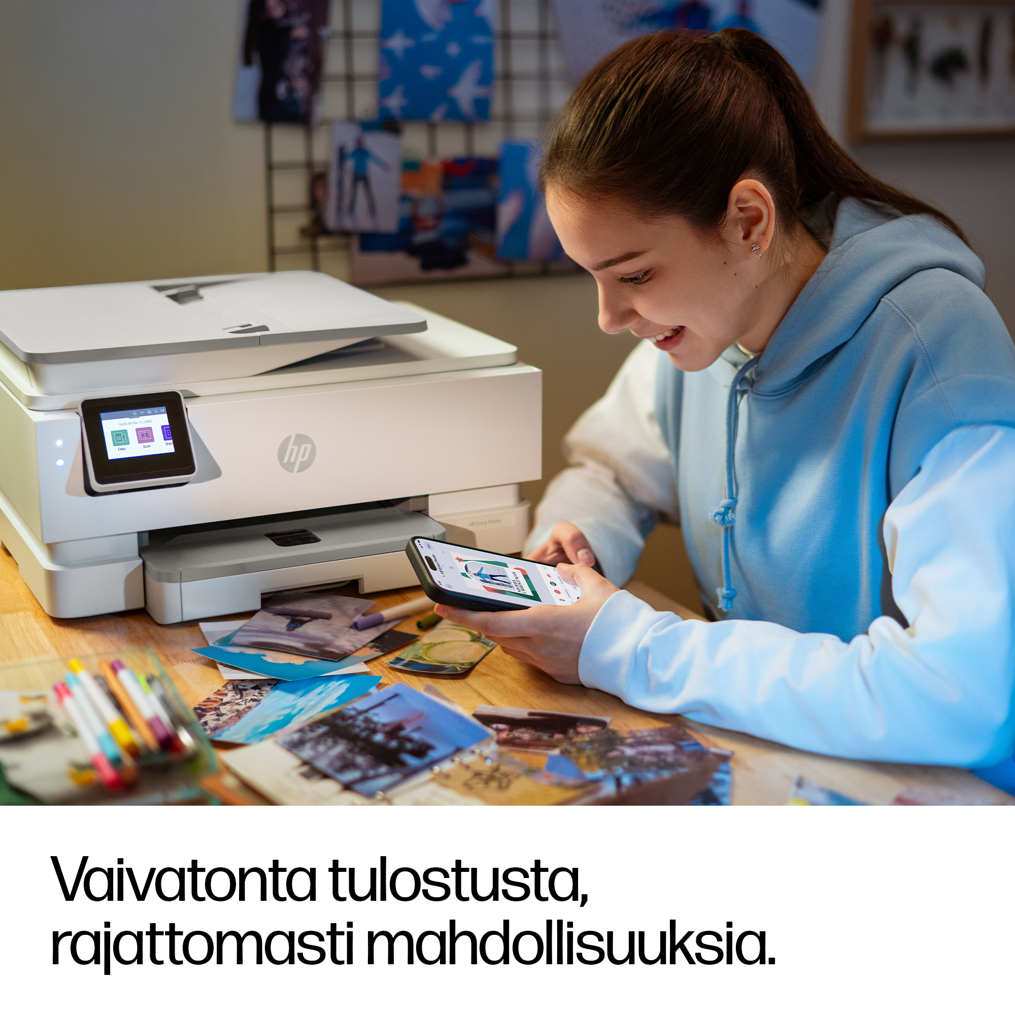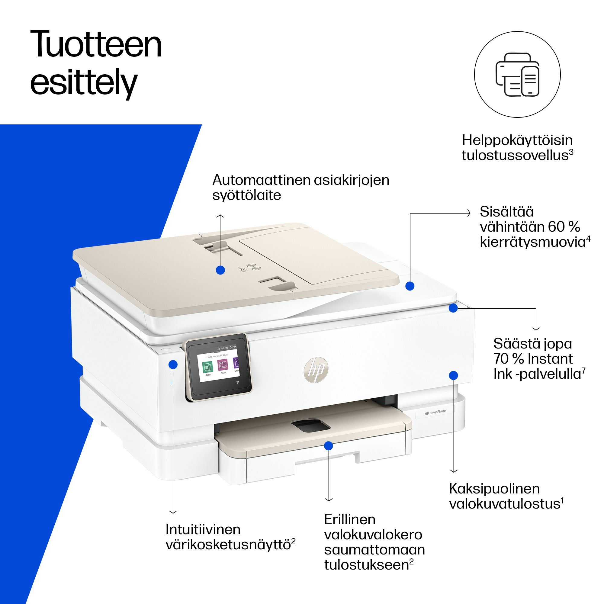 Tämä HP Envy Photo All-in-One -tulostin sisältää vähintään 60 % kierrätysmuovia.[4]