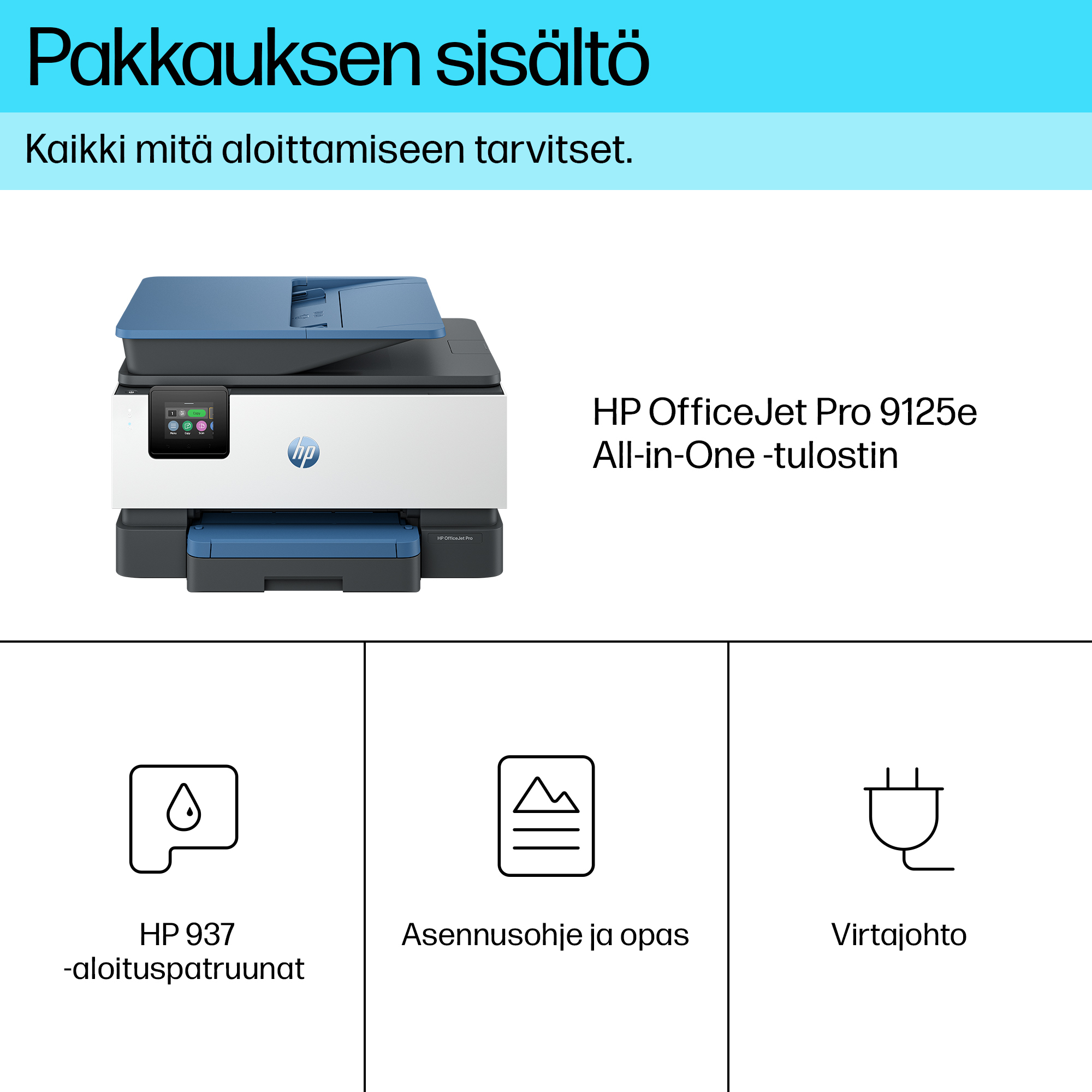 | Laatikon sisältö | HP OfficeJet Pro 9125e All-in-One -tulostin; HP 937 musta aloituspatruuna;HP 937 syaani aloituspatruuna;HP 937 magenta aloituspatruuna;HP 937 keltainen aloituspatruuna;Säännöstiedote;Tarvikehuomautus;Virtajohto;Asennusohje;Pikaopas [Lisätietoja täytöstä ja riittoisuudesta saa osoitteesta http://www.hp.com/go/learnaboutsupplies] |
