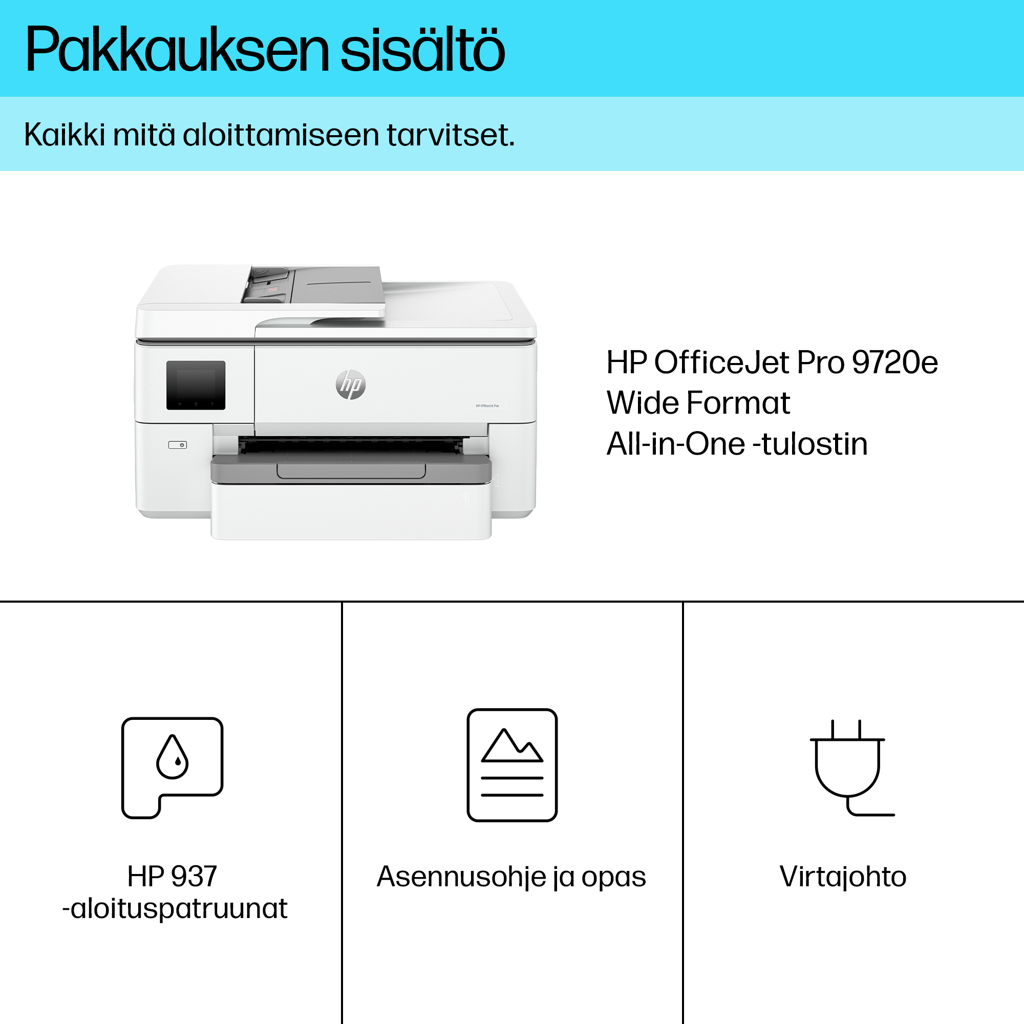| Laatikon sisältö | HP OfficeJet Pro 9720e Wide Format All-in-One -tulostin; HP 937 musta aloituspatruuna; HP 937 syaani aloituspatruuna; HP 937 magenta aloituspatruuna; HP 937 keltainen aloituspatruuna; Säännöstiedote; Tarvikehuomautus; Virtajohto; Asennusohje; Pikaopas; [Saat lisätietoja täytöstä ja riittoisuudesta osoitteesta http://www.hp.com/go/learnaboutsupplies] |