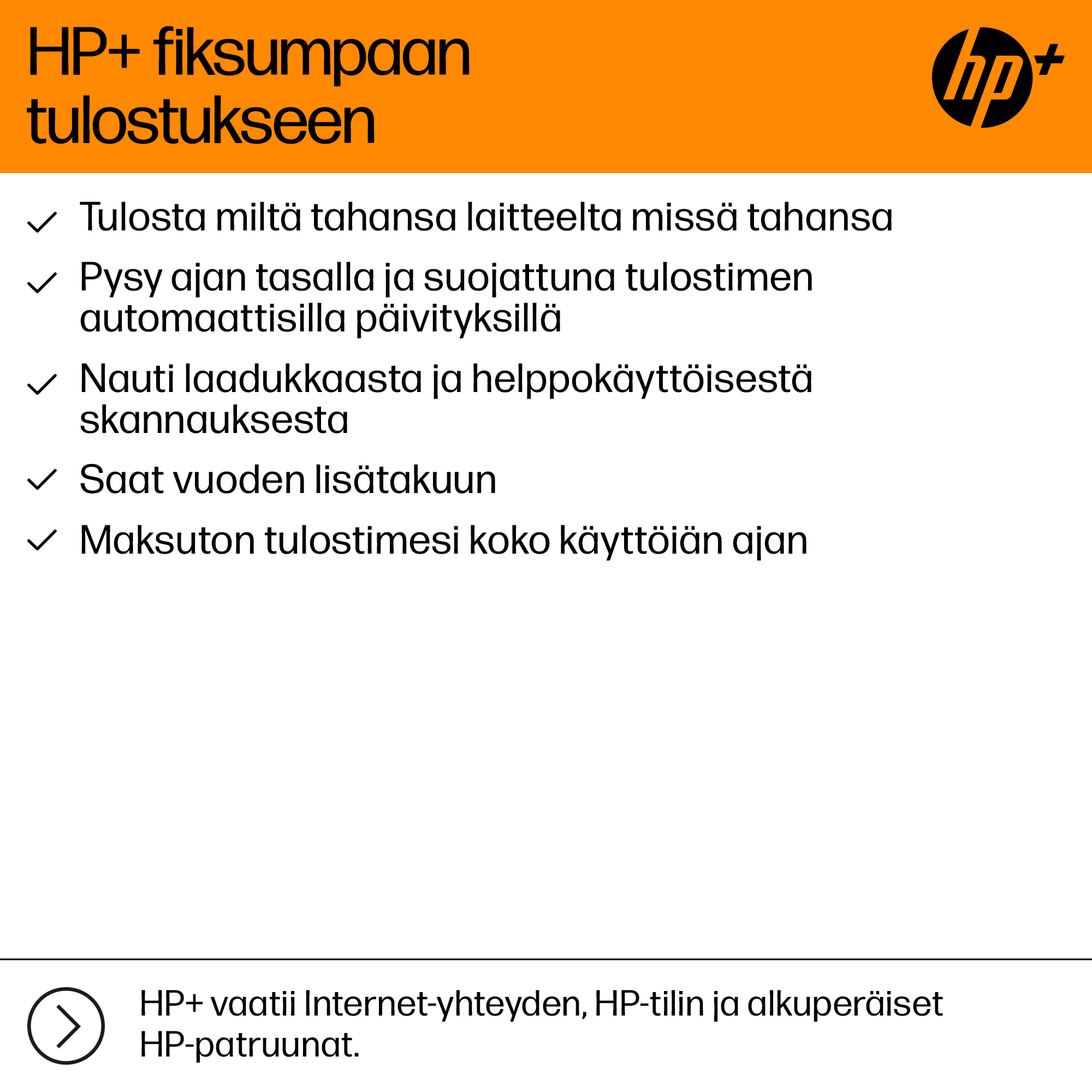Tämä tulostin tukee HP+-palvelua. Voit ottaa edut käyttöön valitsemalla HP+-palvelun tuotetta asennettaessa. HP+-käyttö edellyttää HP-tiliä, jatkuvaa Internet-yhteyttä ja vain alkuperäisten HP-mustepatruunoiden käyttöä tulostimen käyttöiän ajan. Lisätietoja: http://www.hp.com/plus