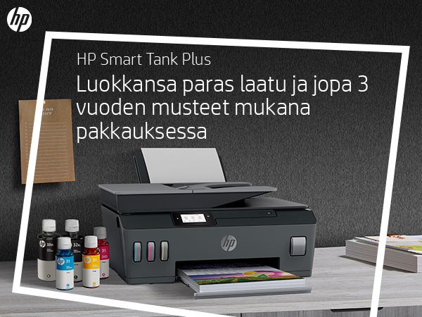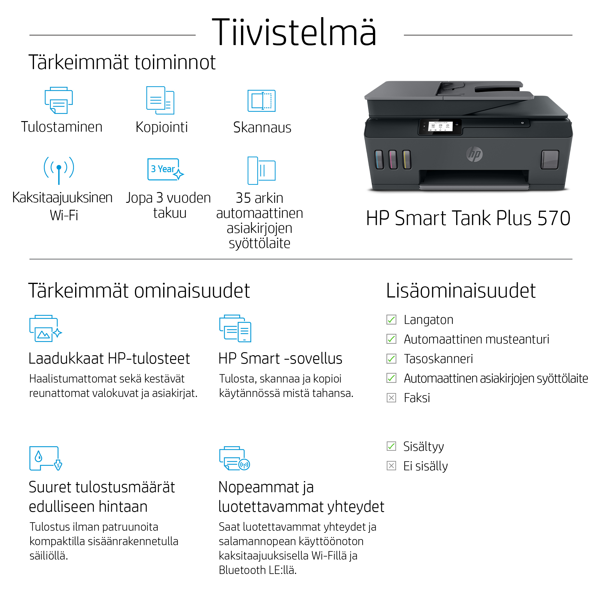 | Laatikon sisältö | HP Smart Tank Plus 570; 2 x HP 32XL 135 ml:n alkuperäinen musta mustepullo; HP 31, alkuperäinen syaani mustepullo; HP 31, alkuperäinen magenta mustepullo; HP 31, alkuperäinen keltainen mustepullo; mustehuomautus; uudelleenpakkauksen tiedote; asennusopas; viiteopas; säännöstiedote; PT-tiedote; RoH-EAC-säännöstiedote; pidennetyn takuun tiedote; virtajohto; Saat lisätietoja täytöstä ja riittoisuudesta osoitteesta http://www.hp.com/go/learnaboutsupplies |