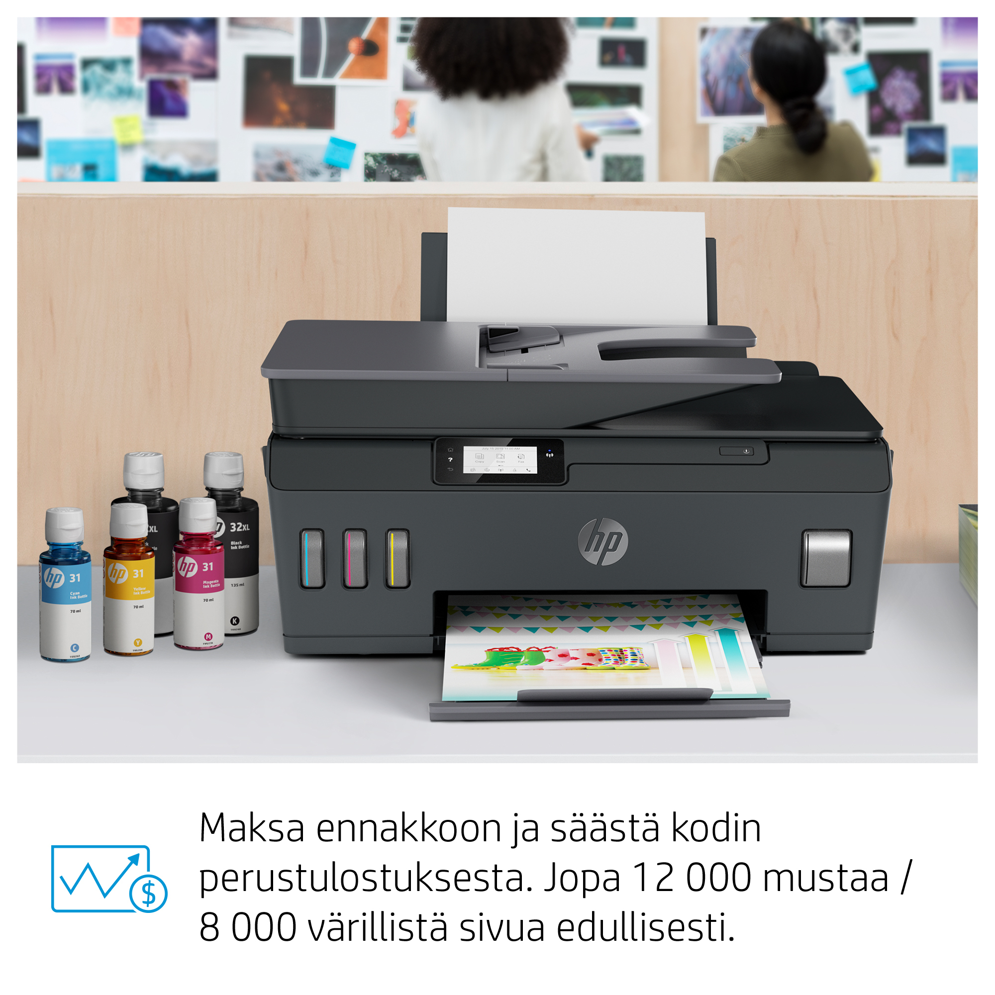 | Vaihtopatruunat | HP 32 alkuperäinen musta mustepullo, 90 ml 1VV25AE; HP 31 alkuperäinen syaani mustepullo, 70 ml 1VU26AE; HP 31 alkuperäinen magenta mustepullo, 70 ml 1VU27AE; HP 31 alkuperäinen keltainen mustepullo, 70 ml 1VU28AE; HP 32XL alkuperäinen musta mustepullo, 135 ml 1VV24AE. Lisätietoja täytöstä ja riittoisuudesta on osoitteessa http://www.hp.com/go/learnaboutsupplies |